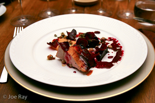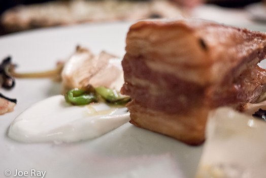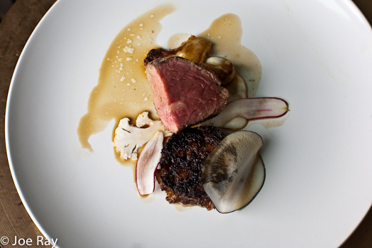 The big gun, however, was the lamb breast main course, cooked sous-vide for a long time then sizzled for a short time to create a crispy/melting combination that recalls the textures of a savory crème brulée. Nearby, a comma of yogurt, dollops of a light mint aspic and gently-braised leaves of, I believe, radicchio and swiss chard provided punctuation marks of acidity, bitterness and a faint sweetness. Any three-star restaurant would be proud to serve the dish at three times the price.