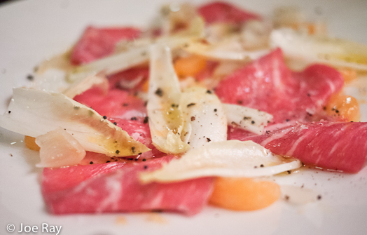 These guys, particularly chef Carlo Mirachi, have some serous friends in the food sourcing business. ‘Beef Carpaccio’ shows up with the marbling of something noteworthy and turns out to be Wagyu from a farm on a big, flat state out west. A drizzle of stellar olive oil creates a dreamy, one-two-three-four adagio progression between vegetal freshness, slick vegetable fat, beefy meatiness and Wagyu fat. I got as much pleasure nibbling away at it as watching Elisabeth enjoy it – something she readily encouraged.